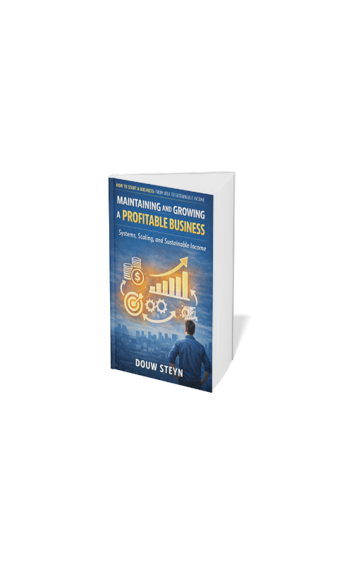 A practical guide for South African entrepreneurs who have moved beyond survival and want to build a stable, profitable, and sustainable business. Learn how to systemise what works, improve profit before chasing growth, retain customers, manage risk, and design a business that supports long-term income and lifestyle freedom.