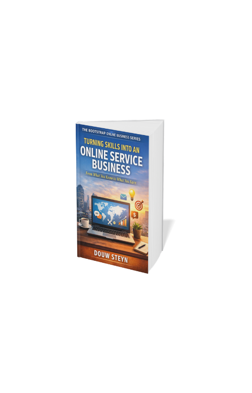 Turning Skills into an Online Service Business by Douw Steyn is a step-by-step guide designed for beginners, side hustlers, and aspiring entrepreneurs in South Africa.